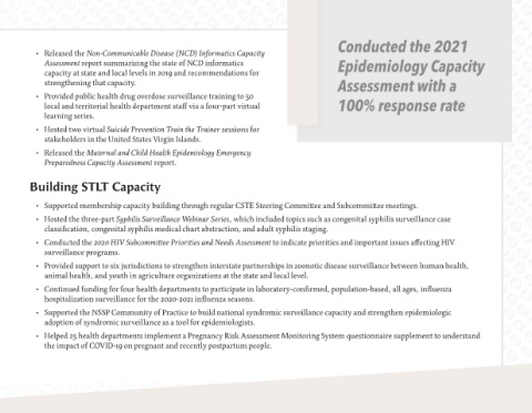 • Supported the NSSP Community of Practice to build national syndromic surveillance capacity and strengthen epidemiologic