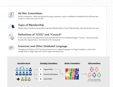 Throughout the bylaws, CSTE fixed grammatical errors, updated language out of legal compliance, and revised
