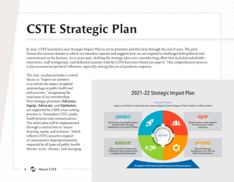 In 2021, CSTE launched a new Strategic Impact Plan to set its priorities and direction through the end of 2022. The plan